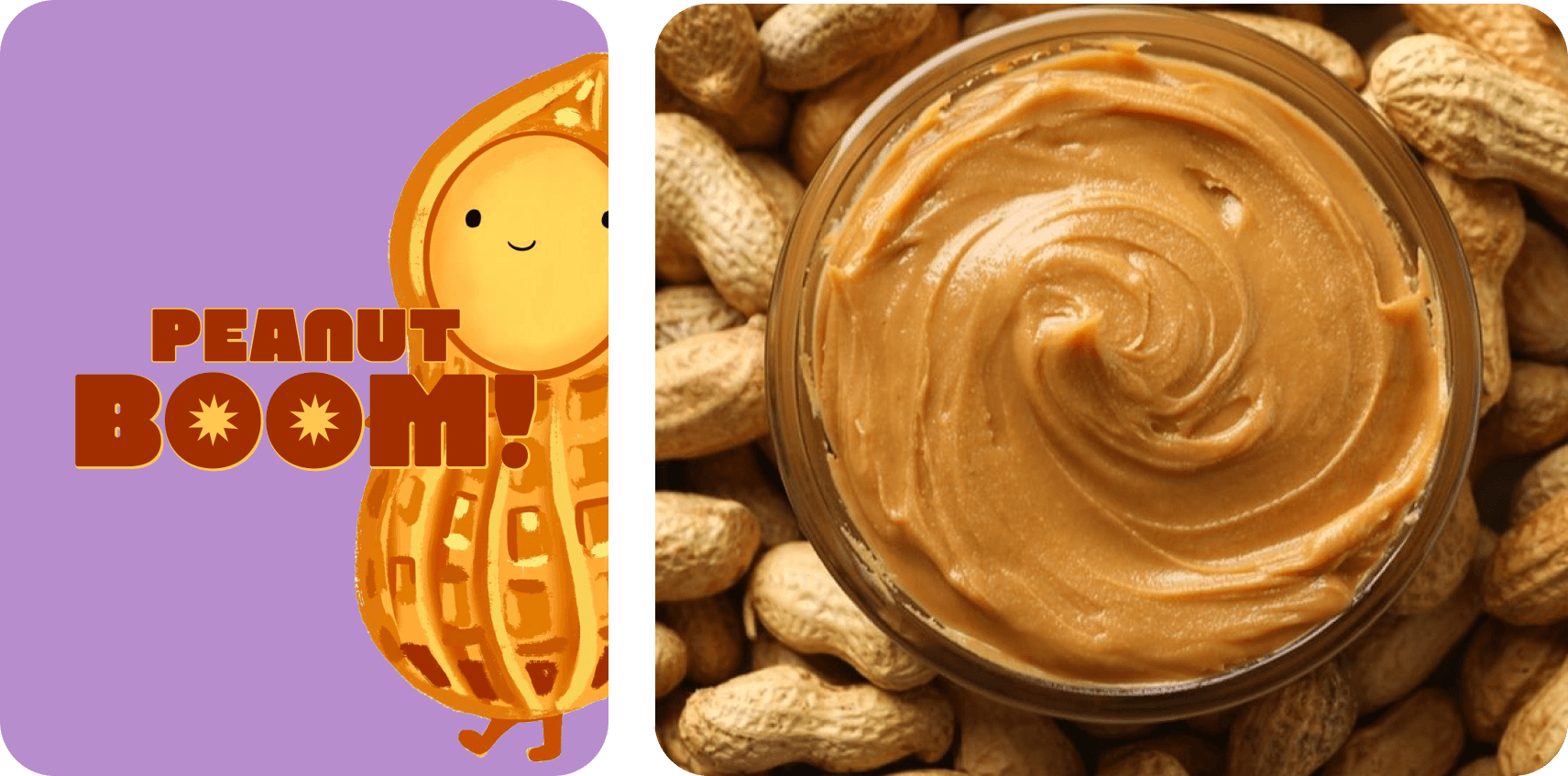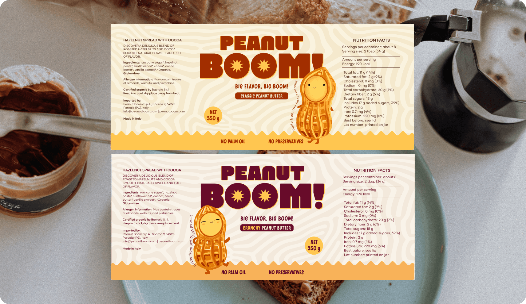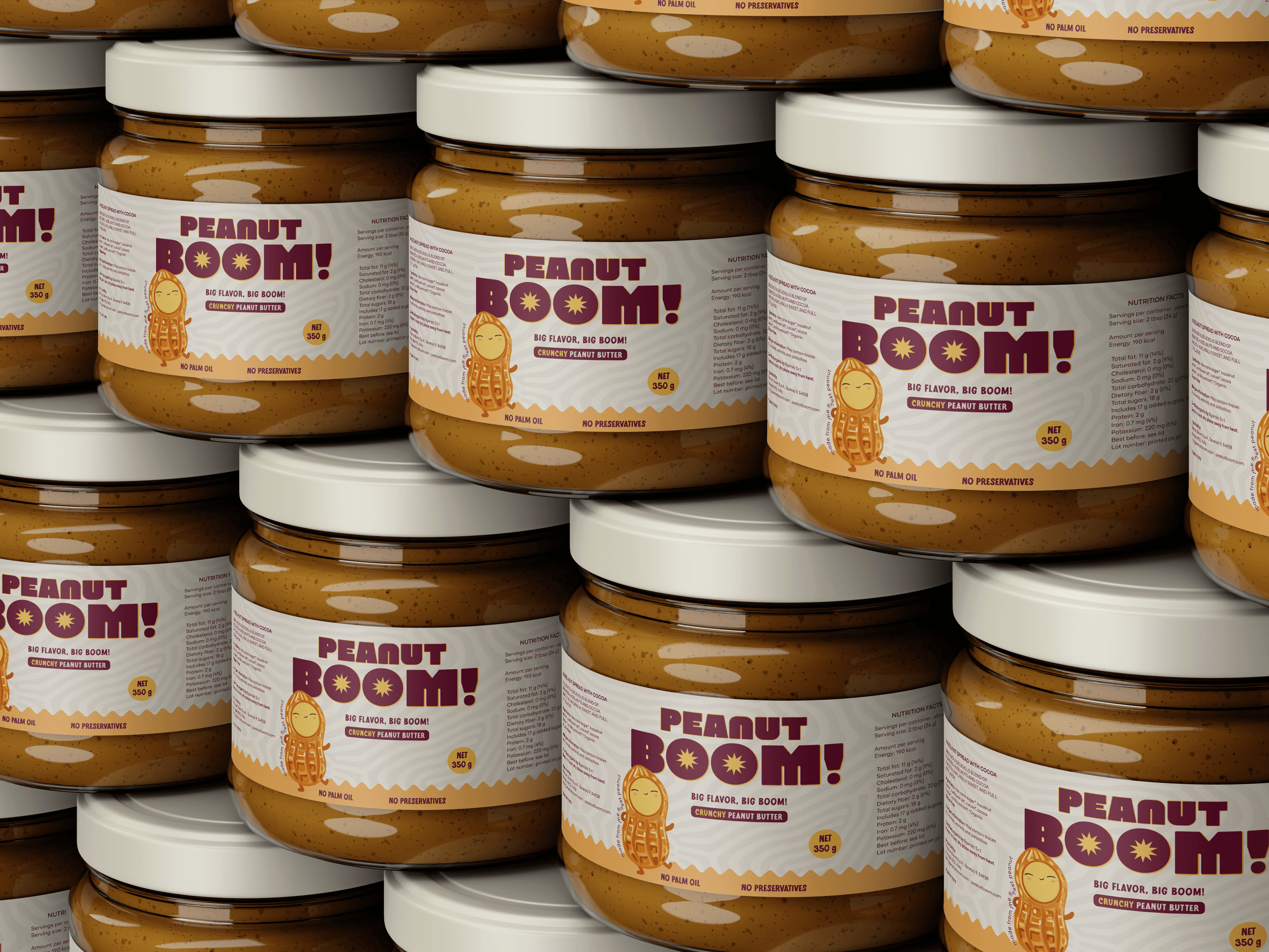 As you gaze at the label, the world of Peanut Boom opens up — vibrant typography bursts with energy, echoing the big flavor inside, while warm tones and friendly details highlight the authenticity of a product made with care.